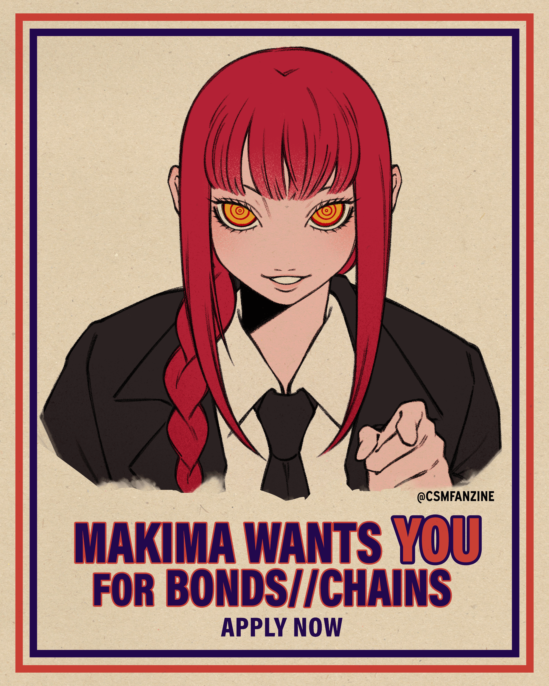 BONDS//CHAINS is a for-profit Chainsaw Man fan anthology embracing the BONDS that connect (and CHAIN) the incredible cast of Chainsaw Man. From friendship to family to control to exploitation, Chainsaw Man Fanzine aims to examine the rich interpersonal connections at the series’ Pochita heart.We envision this project as inclusive of the whole cast and to be similar in content to Chainsaw Man.